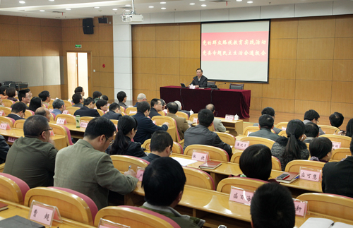 11月21日上午,我校在学术中心第二报告厅召开党的群众路线教育实践活动党委专题民主生活会情况通报会。校党委书记韩翼祥主持会议并作情况通报发言。省委第19督导组副组长胡浙平,成员邵鉴医、陈钦林、缪江平到会指导。