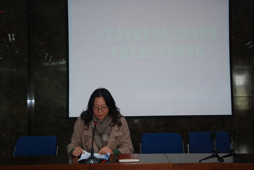 12月10日下午,外国语学院党总支在8号楼208报告厅召开党的群众路线教育实践活动专题民主生活会情况通报会。学校第三督导组成员申屠莉全程指导。外国语学院全体教职工和学生党支部书记参加会议。会议由学院党总支副书记朱丹主持。